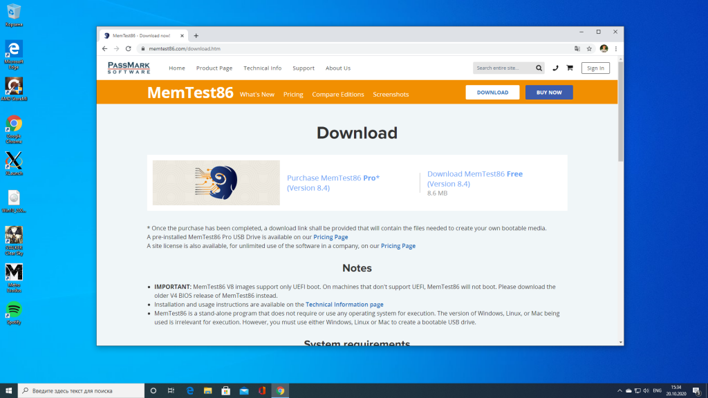 Скачать программу можно с официального сайта. Я рекомендую всегда скачивать программы из официальных источников, потому что так намного безопаснее, и вы получите всегда самую новую версию. Иногда Memtest86 поставляется вместе с дистрибутивами Linux, и её можно запустить из меню Grub, но, как правило, там очень старая версия. На странице загрузки доступна платная и бесплатная версии, выбирайте бесплатную (Free):