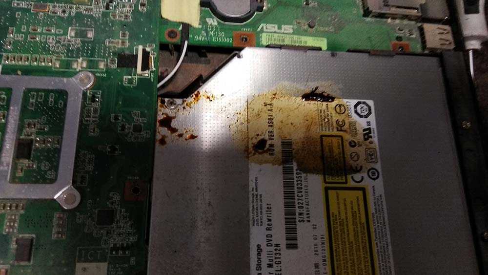 Такая же история была с самой крышкой корпуса. Засохший сладкий кофе, почти намертво склеил DVD привод с крышкой.