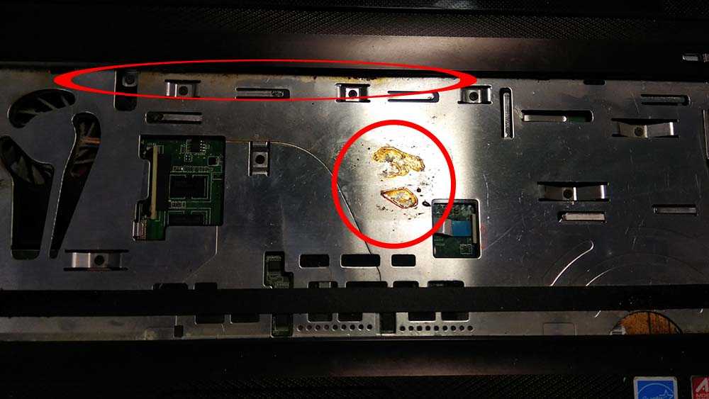 Тут у меня закралось предположение, что ноутбук даже не разбирали, так как при ремонте, данные следы должны были быть убраны. Сама материнская плата была вся в пыли, но к счастью не залита. Следов ремонта на ней тоже обнаружено не было.