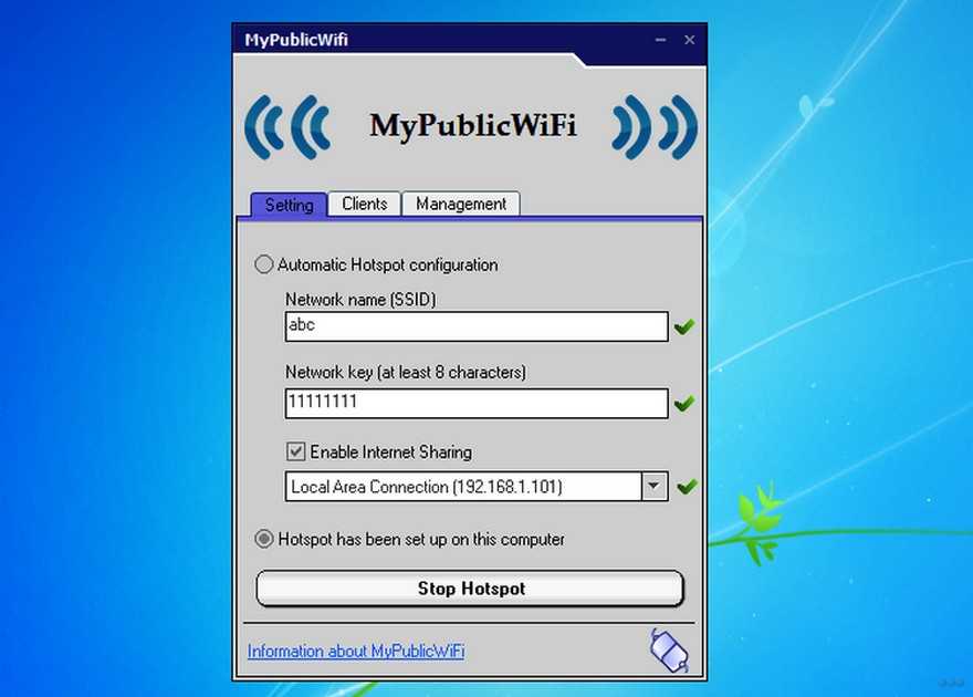 mHotspot — простая в использовании программа, позволяющая развертывать беспроводную точку доступа Wi-Fi буквально в пару кликов. Сразу после запуска пользователю требуется лишь ввести данные для создаваемого виртуального Wi-Fi-соединения — идентификатор сети (SSID) и пароль (должен состоять из 8 символов или более) — затем кликнуть по кнопке «StartHotspot».