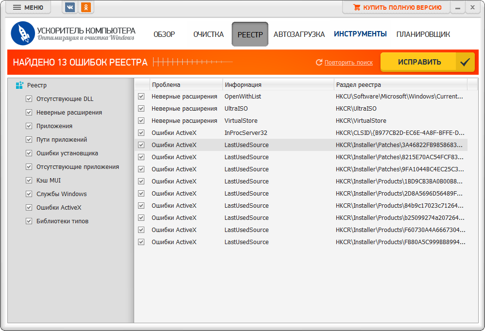 Вторая группа — «Реестр», не имеет подгрупп. Здесь находится средство исправления ошибок реестра и очистки его от мусора.