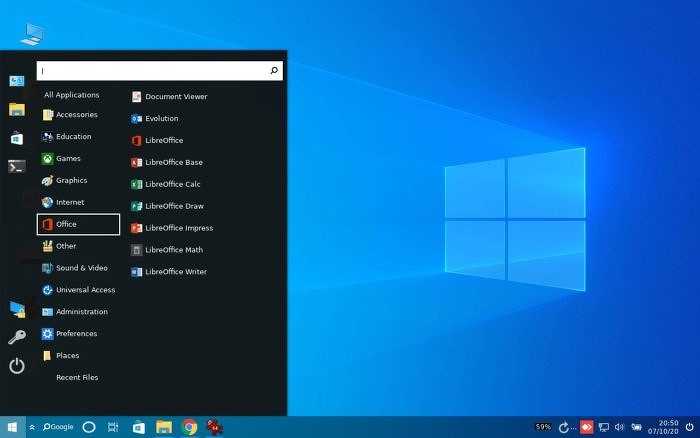 Windows-подобная оболочка – это глубокого кастомизированная среда Cinnamon, и визуально отличить ее от оболочки, разработанной Microsoft, будет трудно, поскольку даже при загрузке ОС на экране отображается логотип Windows 10. Девелоперы скопировали «Пуск», панель задач, окна календаря и часов, системный трей, «Проводник» и даже меню виртуальных рабочих столов, как и окно переключения между запущенными программами.