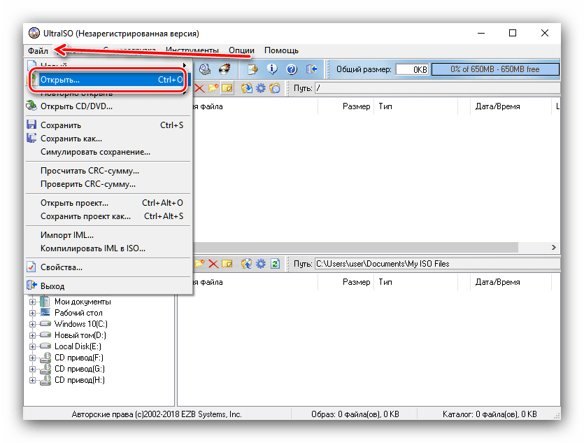 - Для начала необходимо запустить саму программу. Затем открываем образ, который мы собираемся монтировать — для этого воспользуемся пунктами меню «Файл» — «Открыть».