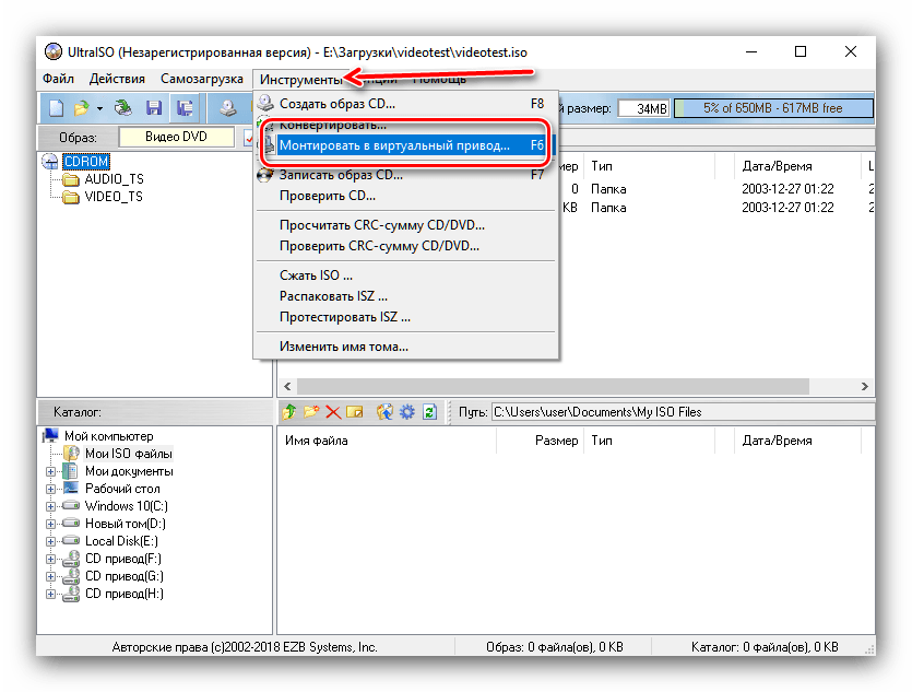 Снова используем меню, выбирая опции «Инструменты» — «Монтировать в виртуальный привод».