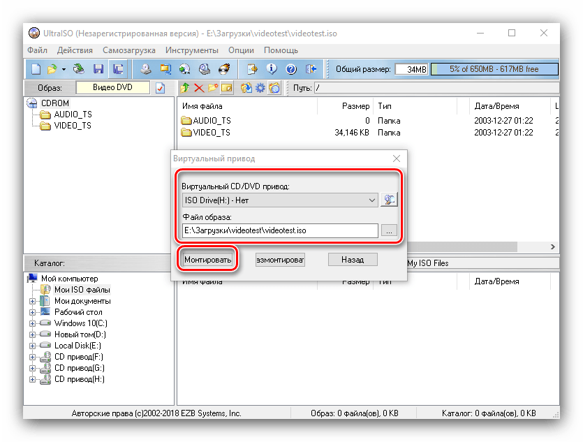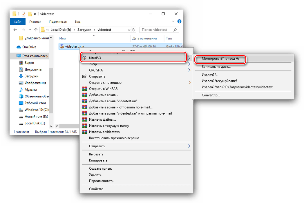 Монтирование образа оптического накопителя — это процесс подключения виртуального диска к виртуальному приводу. Проще говоря, это виртуальная вставка диска в дисковод. В программе UltraISO процедура выполняется двумя методами — через приложение или же прямо из «Проводника».