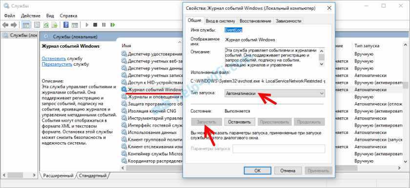 Находим службу ‘Журнал событий Windows’ и открываем ее свойства (нажав на нее правой кнопкой мыши). Проверяем, установлен ли тип запуска ‘Автоматически’ и запущена ли сама служба. Если нет – нажимаем на кнопку ‘Запустить’. Можно попробовать остановить ее и запустить заново.