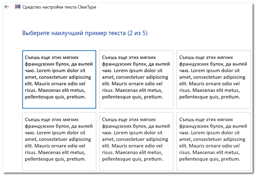 Средство настройки текста ClearType было разработано компанией Microsoft и позволяет подобрать наиболее оптимальное отображение системных надписей. Пользователю показывают несколько картинок, а ему нужно выбрать, какая из них является наилучшей. Вся процедура осуществляется так: