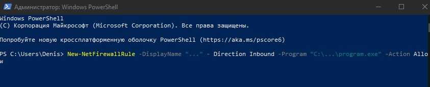 New-NetFirewallRule -DisplayName «…» — Direction Inbound -Program «C:\…\program.exe» -Action Allow. Пропущенные значения заменяются идентично.