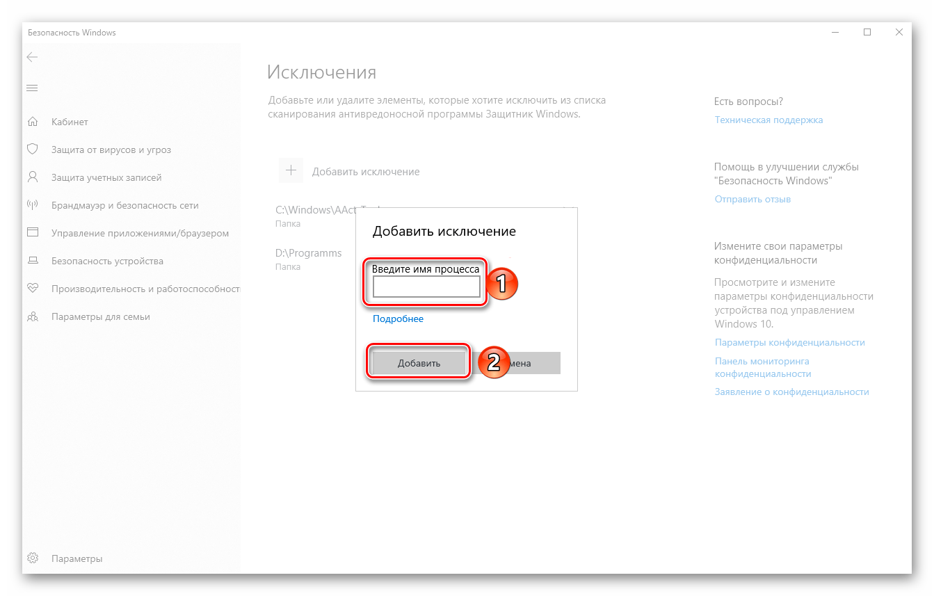 Добавление в исключения Защитника Windows 10 файла, папки или программы