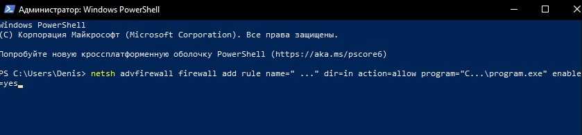 При желании, аналогичные действия можно выполнить и с помощью PowerShell. В этом случае для добавления исключения в Брандмауэр Windows 10 нужно использовать вот такую команду: