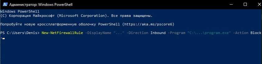New-NetFirewallRule -DisplayName «Program name» -Direction Inbound -Program «C:pathprogram.exe» -Action Block